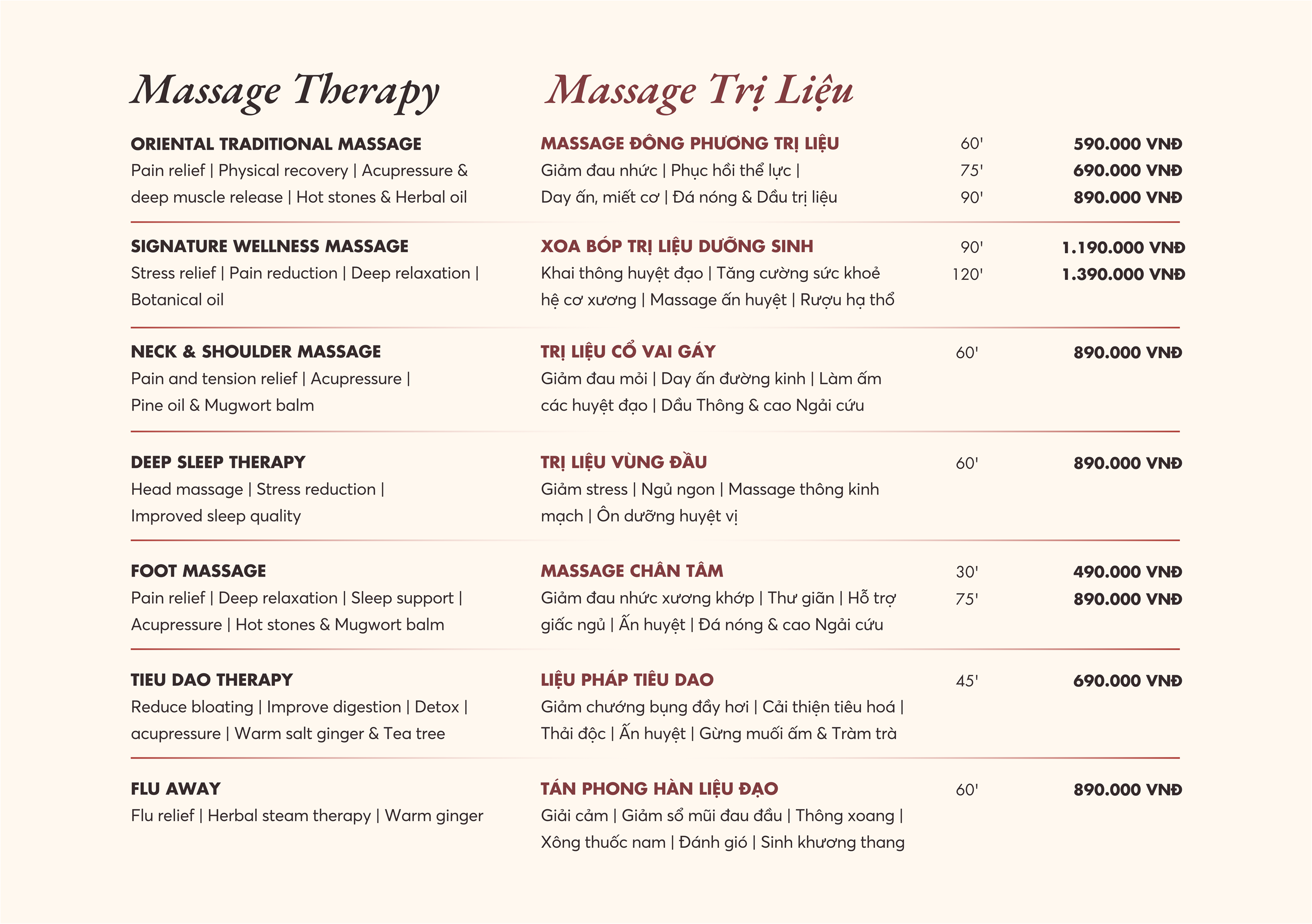 • Massage Đông Phương Trị Liệu – Kỹ thuật xoa bóp bấm huyệt giúp lưu thông khí huyết, phục hồi năng lượng.